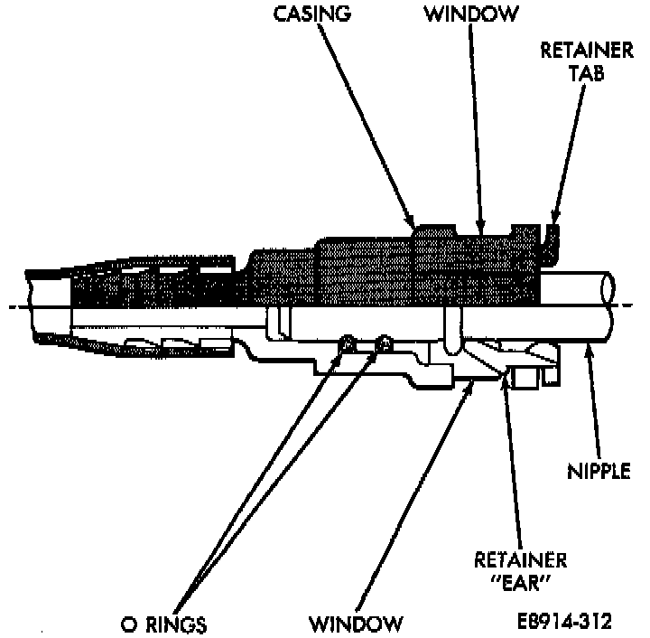 The quick-connect fitting consists of the O-rings, retainer and casing. When the fuel tube enters the fitting, the retainer locks the shoulder of the nipple in place and the O-rings seal the tube.