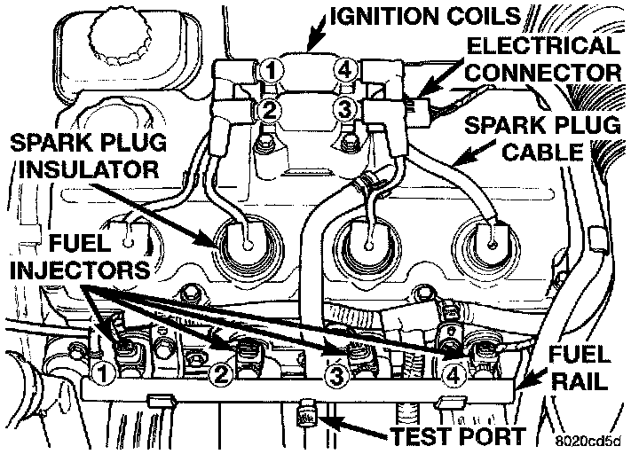 NOTE: The fuel system operates at approximately 331 kPa (48 psi). Check fuel system pressure at the test port on the fuel rail (Fig. 7).