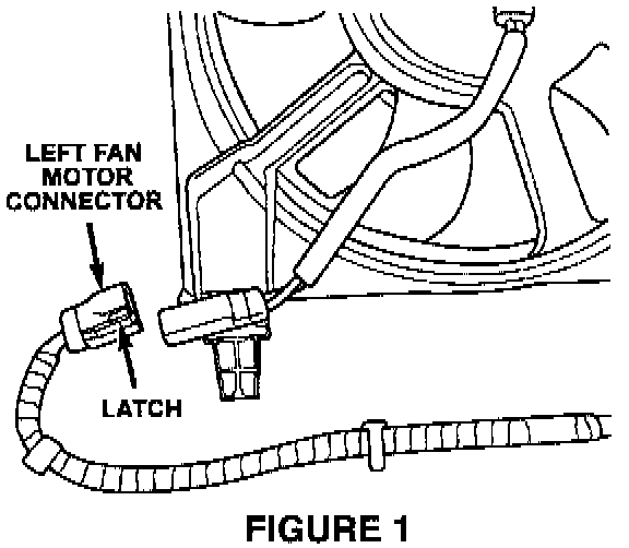3. Locate the left (drivers' side) black fan motor connector. Retract the red latch on the two-way female connector, depress the thumb latch, and disconnect the connector from the tan (Figure 1). If the wiring to the fan motor is clipped into the tan support, gently pry it out of the hole so the fan is not damaged.