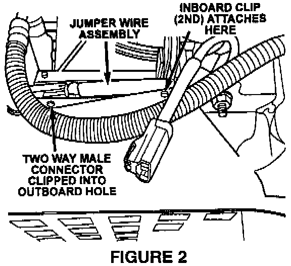 A. Attach the black two-way male connector with the clip into the outboard hole, so the connector faces outboard toward the left side of the vehicle. Attach the second clip into the inboard hole of the lower reinforcement that the original wiring came out of (Figure 2).