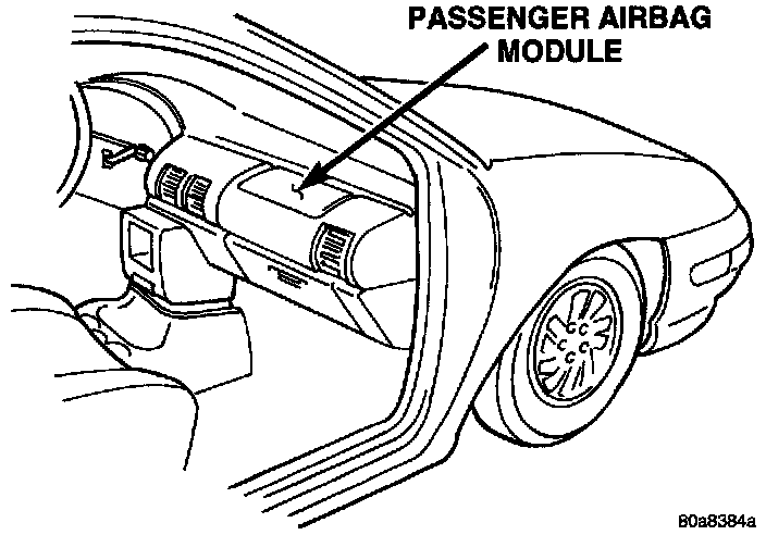 The Passenger Airbag Module is located beneath the decorative cover of the instrument panel, facing the passenger seat.
