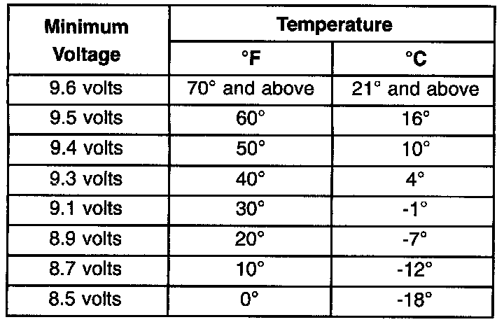 5. Voltage drop will vary according to battery temperature at the time of the load test. Battery temperature can be estimated by the temperature of exposure over the preceding several hours. If the battery has been charged or boosted a few minutes prior to the test, the battery would be slightly warmer.