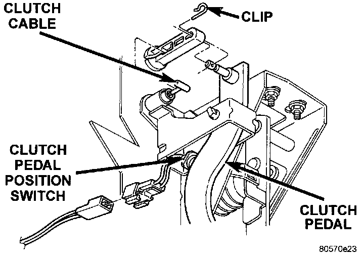 The clutch pedal position switch is mounted to a bracket located behind the clutch pedal. The switch is held in place by four plastic wing tabs.