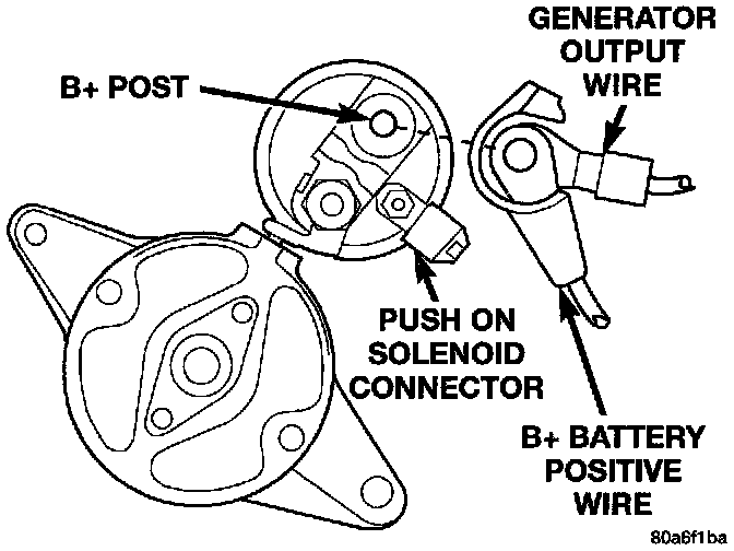 7. Remove the battery positive cable nut and remove the battery positive and generator output wire from the starter.
