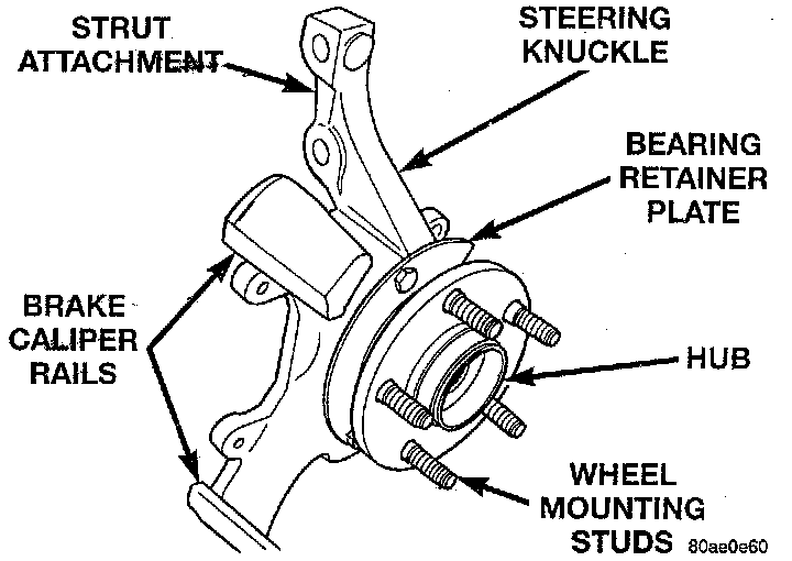The steering knuckle used on this vehicle is a cast iron casting. The steering knuckle has machined legs for attachment to the McPherson strut and lower ball joint. The steering knuckle also has machined abutments on the casting to support and align the caliper for the front disk brakes. The steering knuckle also has the bearing supporting the front hub and outer C/V joint of the drive shaft pressed into it. The hub bearing is a press fit into the steering knuckle but is additionally geld in place by a retaining plate bolted to the front of the steering knuckle. The hub is positioned through the bearing and knuckle, with the outer C/V joint stub shaft splined through the hub. The outer C/V joint is retained to the hub using a nut. The hub nut is held on the stub shaft using a nut retainer and cotter pin.