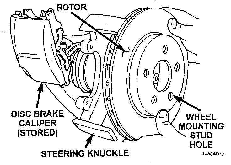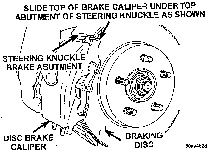 7. Install disc brake caliper assembly on steering knuckle. Caliper is installed by first sliding top of caliper under top abutment on steering knuckle. Then installing bottom of caliper against bottom abutment of steering knuckle.