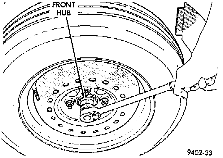 2. Loosen hub nut while vehicle is on the floor with the brakes applied. The hub and driveshaft are splined together through the knuckle (bearing) and retained by the hub nut.