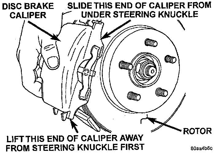 6. Remove disc brake caliper assembly from steering knuckle. Caliper is removed by first lifting bottom of caliper away from steering knuckle, and then removing top of caliper out from under steering knuckle.