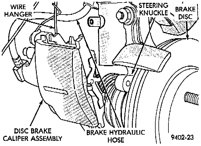 7. Support brake disc brake caliper assembly using a wire hook and not by hydraulic hose.