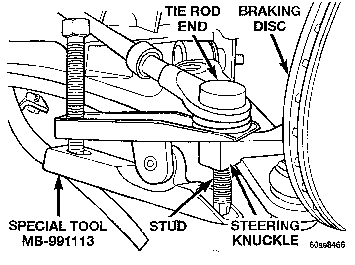 10. Remove the tie rod end from steering knuckle, using Remover, Special Tool MB-991113, or equivalent.