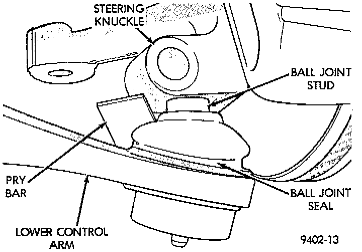 12. Separate ball joint stud from steering knuckle by prying down on lower control arm.