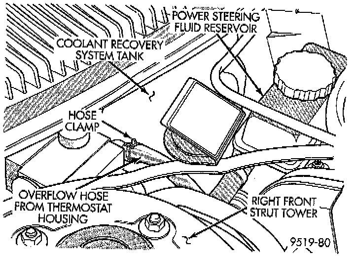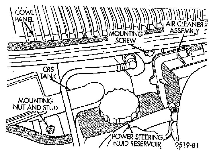 NOTE: Removal of the CRS tank improves access to the power steering fluid reservoir attaching bolts.