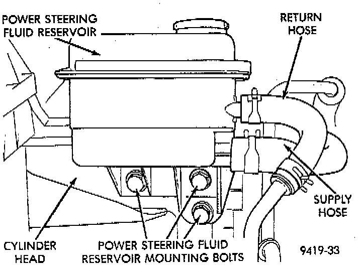 1. Install power steering fluid reservoir on cylinder head. Install and securely tighten the power steering fluid reservoir to cylinder head attaching bolts.