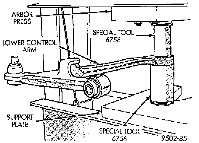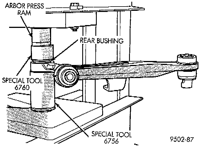 2. Position lower control arm in an arbor press supported at rear bushing using Receiver Cup, Special Tool 6556, or equivalent. Position Remover/Installer, Special Tool 6758, or equivalent on top of rear control arm bushing.