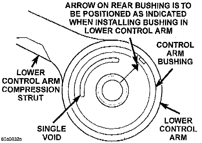 1. Install the rear bushing into the lower control arm in the direction indicated. Rear bushing must be positioned in lower control arm with the void in the bushing pointing toward the compression strut of the lower control arm as shown.