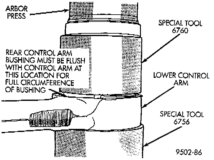 3. Press rear bushing into lower control arm, until flange on bushing is flush with machined surface of lower control arm.
