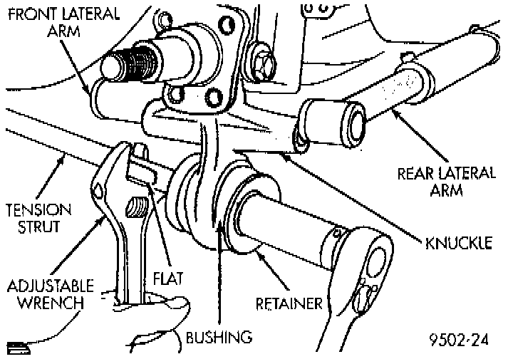 10. Hold tension strut from turning by using a large adjustable wrench on flat of tension strut and remove tension strut nut. Then remove nut, tension strut retainer and rear tension strut bushing from tension strut at rear knuckle.