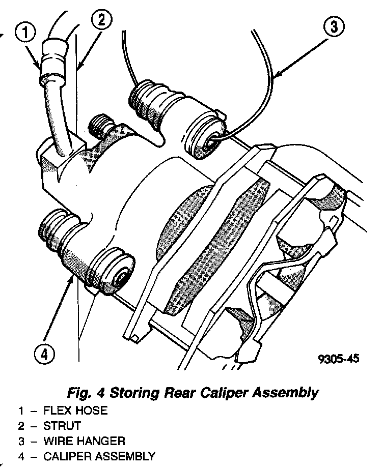3. If vehicle is equipped with rear disc brakes, remove the rear caliper assembly from the adapter. Refer to Brakes and Traction Control. After removing caliper assembly store caliper by hanging it from frame of vehicle. Do not let weight of rear caliper assembly hang from flexible brake hose.