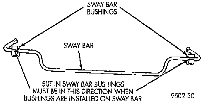 If stabilizer bar to frame rail bushings require replacement at time of inspection, install new bushings before installing stabilizer bar. Bushings are replaced by opening slit on bushings and peeling them off stabilizer bar. Install new bushings on stabilizer bar, by spreading bushing at slit and forcing them on stabilizer bar. Bushings must be installed on stabilizer bar with slit in bushing facing rear of vehicle when stabilizer bar is installed.