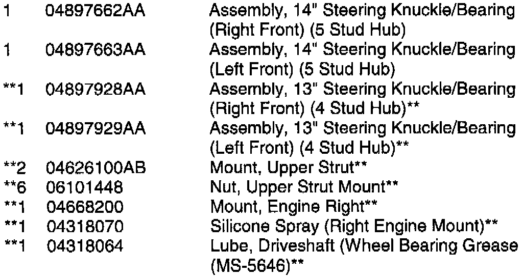 THE 1995 NEONS BUILT IN 1994 USED 13" KNUCKLE ASSEMBLIES WITH 13" OR 14" WHEELS. LATER BUILT VEHICLES HAVE 13" OR 14" KNUCKLE ASSEMBLIES TO MATCH ORIGINAL WHEEL SIZE. TO DETERMINE THE PROPER KNUCKLE SIZE, COUNT THE STUDS ON THE HUB THEN REFER TO THE PARTS LIST PROVIDED IN THIS BULLETIN.