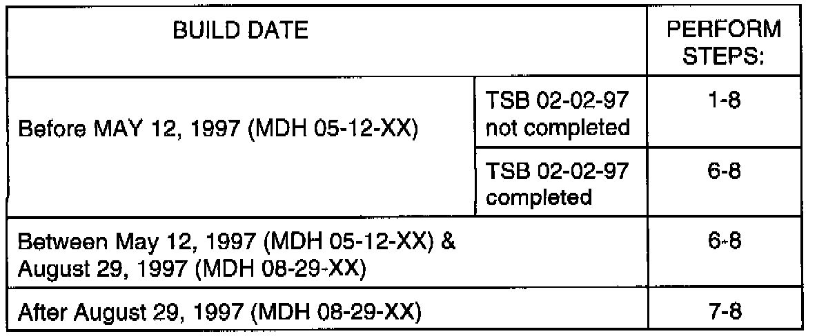 USE TABLE TO DETERMINE WHICH STEPS TO PERFORM BASED ON VEHICLE BUILD DATE AND IF TECHNICAL SERVICE BULLETIN 02-02-97, DATED FEBRUARY 28, 1997 HAS BEEN PERFORMED.**