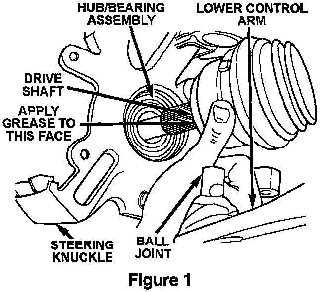 **4. Before the knuckle/bearing/hub assemblies are installed on the vehicle, put a small amount of grease (Wheel Bearing Lube - p/n 04318064) on the entire face of the driveshaft that makes contact with the hub bearing assembly (Figure 1).**