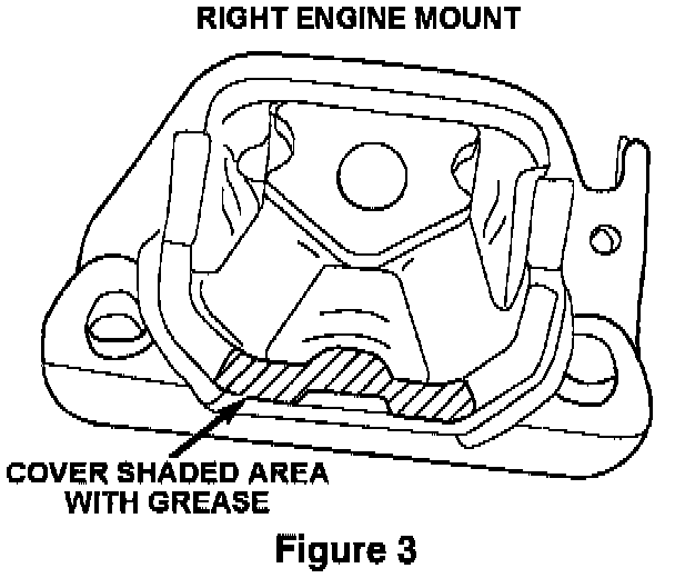 **7. Remove and replace the right engine mount as outlined in the 1998 Neon Service Manual (Publication No. 81-270-8025) (SOHC - pg 9-18)(DOHC - pg 9-64). After replacing the right engine mount, squirt enough grease (Silicone Spray - p/n 04318070) between the mount snubber and the engine bracket to fill the gap (Figure 3).**