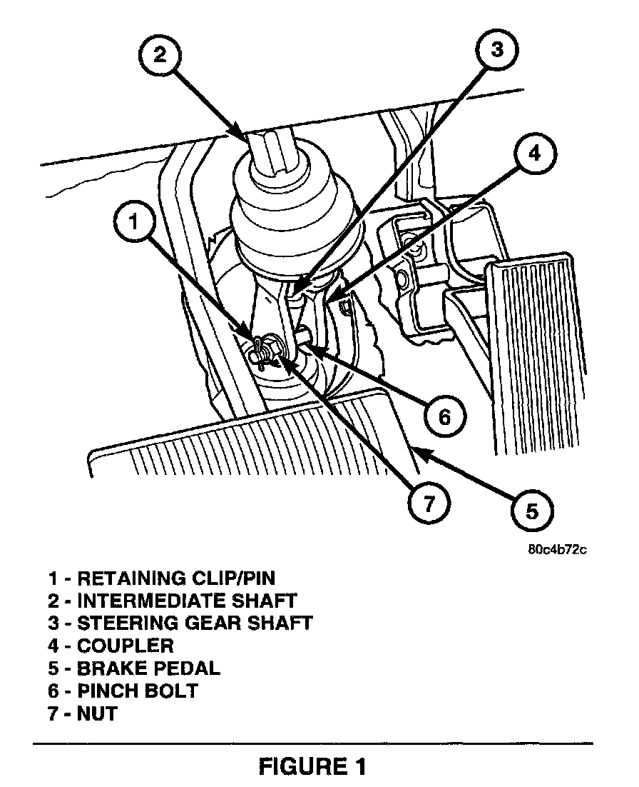 A NEW STEERING GEAR COUPLING PINCH BOLT MUST BE USED WHEN RE-ATTACHING THE INTERMEDIATE SHAFT TO THE STEERING GEAR. THIS BOLT HAS A LOCKING PATCH THAT IS DESTROYED WHEN THE NUT IS REMOVED.