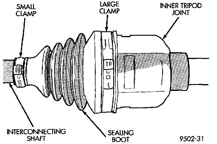 2. Remove large boot clamp that retains inner tripod joint sealing boot to tripod joint housing and discard. Then remove small clamp that retains inner tripod joint sealing boot to interconnecting shaft and discard. Remove the sealing boot from the tripod housing and slide it down the interconnecting shaft.