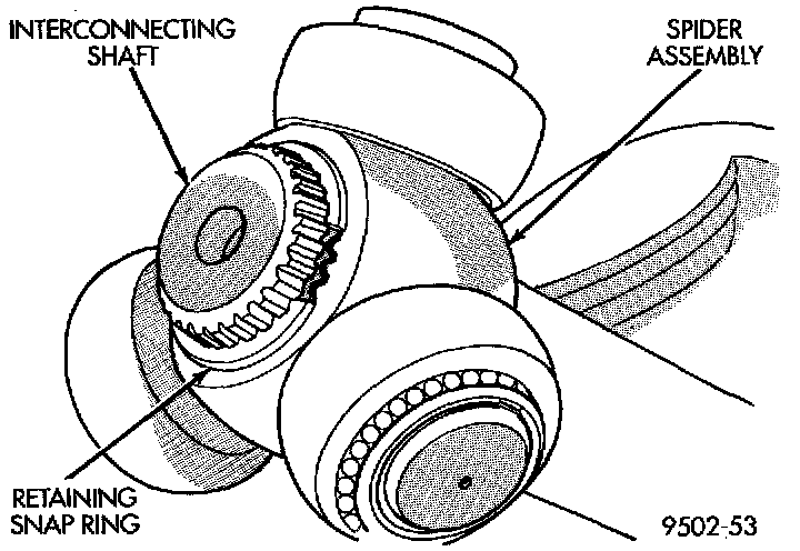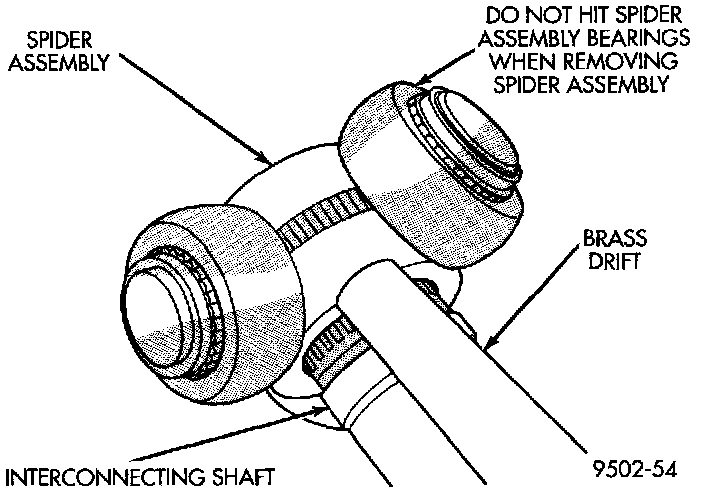 4. Remove snap ring that retains spider assembly to interconnecting shaft. Remove the spider assembly from interconnecting shaft. If spider assembly will not come off interconnecting shaft by hand, it can be removed by tapping spider assembly with a brass drift. Do not hit the outer tripod bearings in an attempt to remove spider assembly from interconnecting shaft.