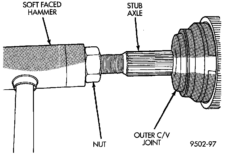 3. Install outer C/V joint assembly onto interconnecting shaft by using a soft-faced hammer and tapping end of stub axle (with nut installed) until outer C/V joint is fully seated on interconnecting shaft.