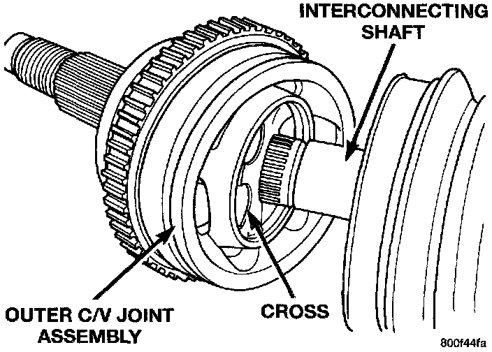 2. Align splines on interconnecting shaft with splines on cross of outer C/V joint assembly and start outer C/V joint onto interconnecting shaft.