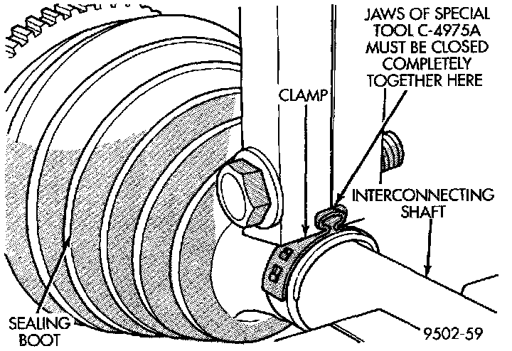 7. Clamp sealing boot onto interconnecting shaft using crimper C-4975-A and the following procedure. Place crimping tool C-4975-A over bridge of clamp. Tighten nut on crimping tool C-4975-A until jaws on tool are closed completely together, face to face.