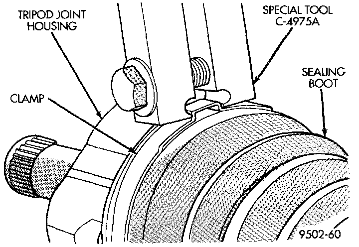 8. Position outer C/V joint sealing boot into its retaining groove on outer C/V joint housing. Install sealing boot to outer C/V joint retaining clamp evenly on sealing boot.