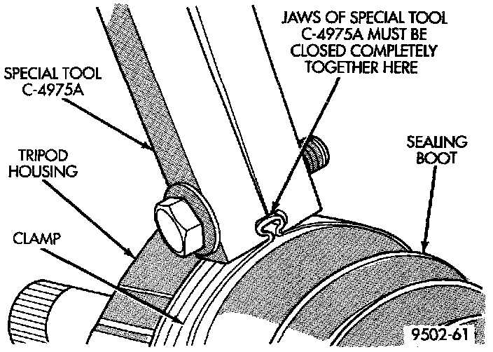 9. Clamp sealing boot onto outer C/V joint housing using Crimper C-4975-A and the following procedure. Place crimping tool C-4975-A over bridge of clamp. Tighten nut on crimping tool C-4975-A until jaws on tool are closed completely together, face to face.