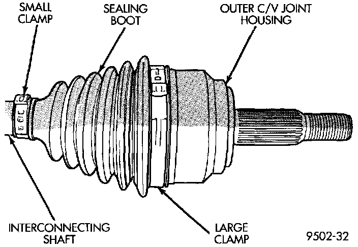 2. Remove large boot clamp retaining C/V joint sealing boot to C/V joint housing and discard. Remove small clamp that retains outer C/V joint sealing boot to interconnecting shaft and discard. Remove sealing boot from outer C/V joint housing and slide it down interconnecting shaft.
