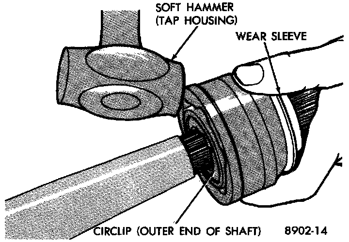 4. Remove outer C/V joint from interconnecting shaft using the following procedure: Support interconnecting shaft in a vise equipped with protective caps on jaws of vise to prevent damage to interconnecting shaft. Then, using a soft-faced hammer, sharply hit the end of the C/V joint housing to dislodge housing from internal circlip on interconnecting shaft. Then slide outer C/V joint off end of interconnecting shaft, joint may have to be tapped off shaft using a soft-faced hammer.