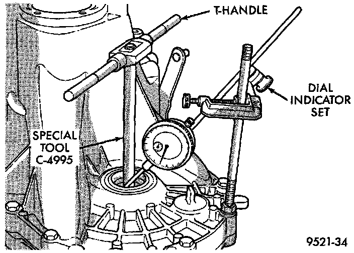 6. Apply a medium load to differential with Tool C-4995 and a T-handle, in the downward direction. Roll differential assembly back and forth a number of times. This will settle the bearings. Zero the dial indicator. To obtain end play readings, apply a medium load in an upward direction while rolling differential assembly back and forth. Record end play.