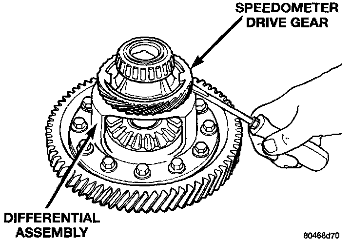 NOTE: The plastic speedometer drive gear must be removed from the differential case in order to service the differential gearsPry Off Speedometer Drive Gear: