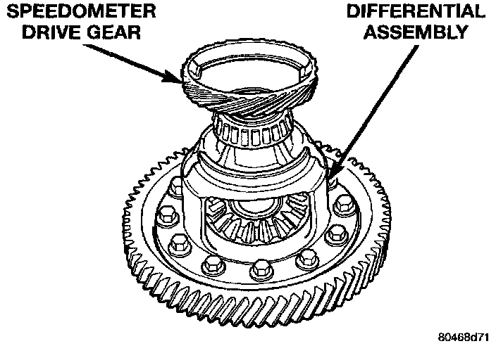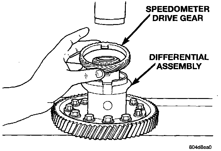 NOTE: A new speedometer drive gear must be installed on differential assembly. The lip on the speedometer drive gear must be positioned downward when installing onto differential assembly.