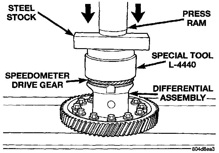 2. Using Miller Tool # L-4440 and steel stock, press speedometer drive gear onto differential. Do not use a hammer.