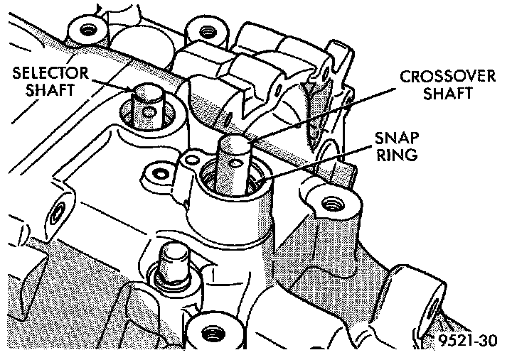 3. Using snap-ring pliers, remove the snap ring at the crossover shaft bore.