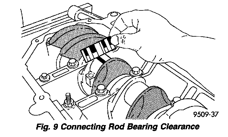 1. Follow the procedure specified in the Standard Service Procedures found under Engine, Service and Repair for Measuring Main Bearing Clearance and Connecting Rod Bearing Clearance (Fig. 9). Refer to Connecting Rod Specification Chart for specifications.