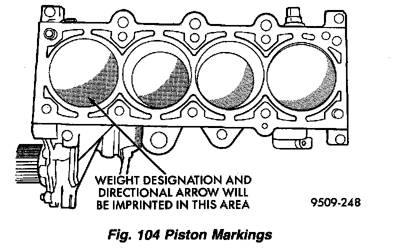 4. Pistons will have a stamping in the approximate location shown (Fig. 106). These stamps will be either a directional arrow or a weight identification for the assembly. L is for light and H is for heavy. These assemblies should all be the same weight class. Service piston assemblies are marked with a S and can be used with either L or H production assemblies. The weight designation stamps should face toward the timing belt side of the engine.