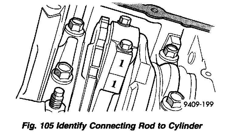2. Remove top ridge of cylinder bores with a reliable ridge reamer before removing pistons from cylinder block. Be sure to keep tops of pistons covered during this operation. Mark piston with matching cylinder number (Fig. 104).