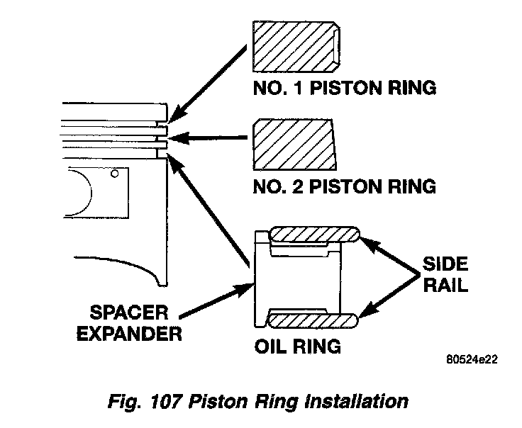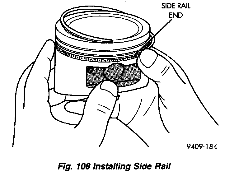 f. Install the side rail by placing one end between the piston ring groove and the expander. Hold end firmly and press down the portion to be installed until side rail is in position. Do not use a piston ring expander (Fig. 108).