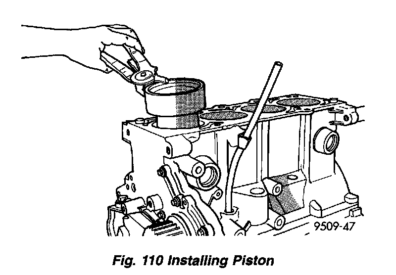 3. Immerse the piston head and rings in clean engine oil, slide the ring compressor, over the piston. Be sure position of rings does not change during this operation (Fig. 110).