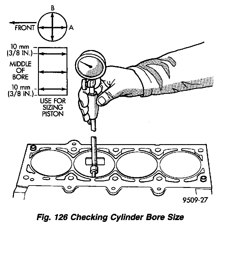 Measure the cylinder bore at three levels in directions A and B. Top measurement should be 10 mm (3/8 inch) down and bottom measurement should be 10 mm (3/8 inch) up from bottom of bore. Refer to Cylinder Bore and Piston Specification Chart for specifications.
