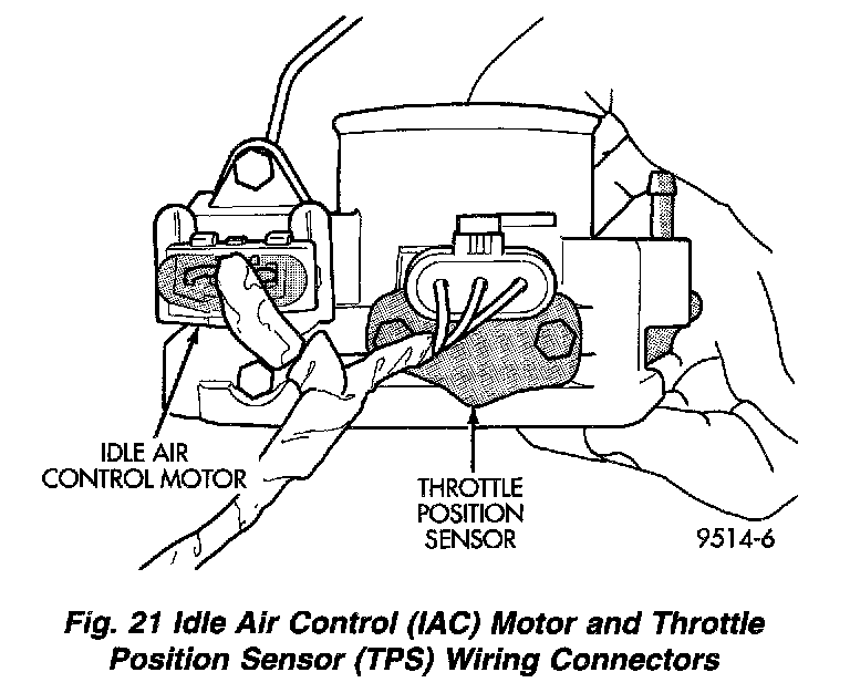 12. Disconnect Idle Air Control (IAC) motor and Throttle Position Sensor (TPS) wiring connectors (Fig. 21).