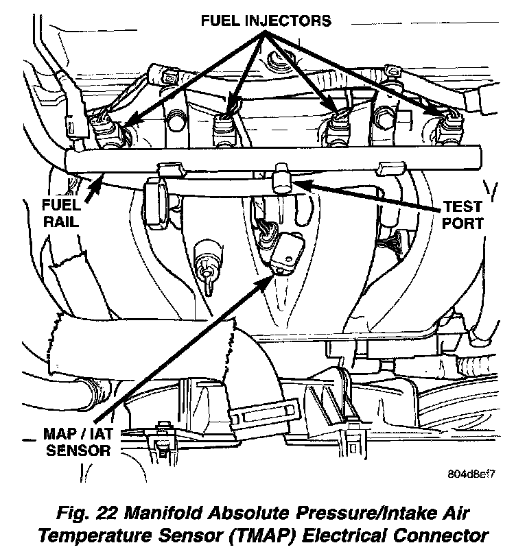 15. Disconnect Manifold Absolute Pressure/Intake Air Temperature sensor (TMAP) electrical connector. Disconnect vapor and brake booster hoses (Fig. 22)